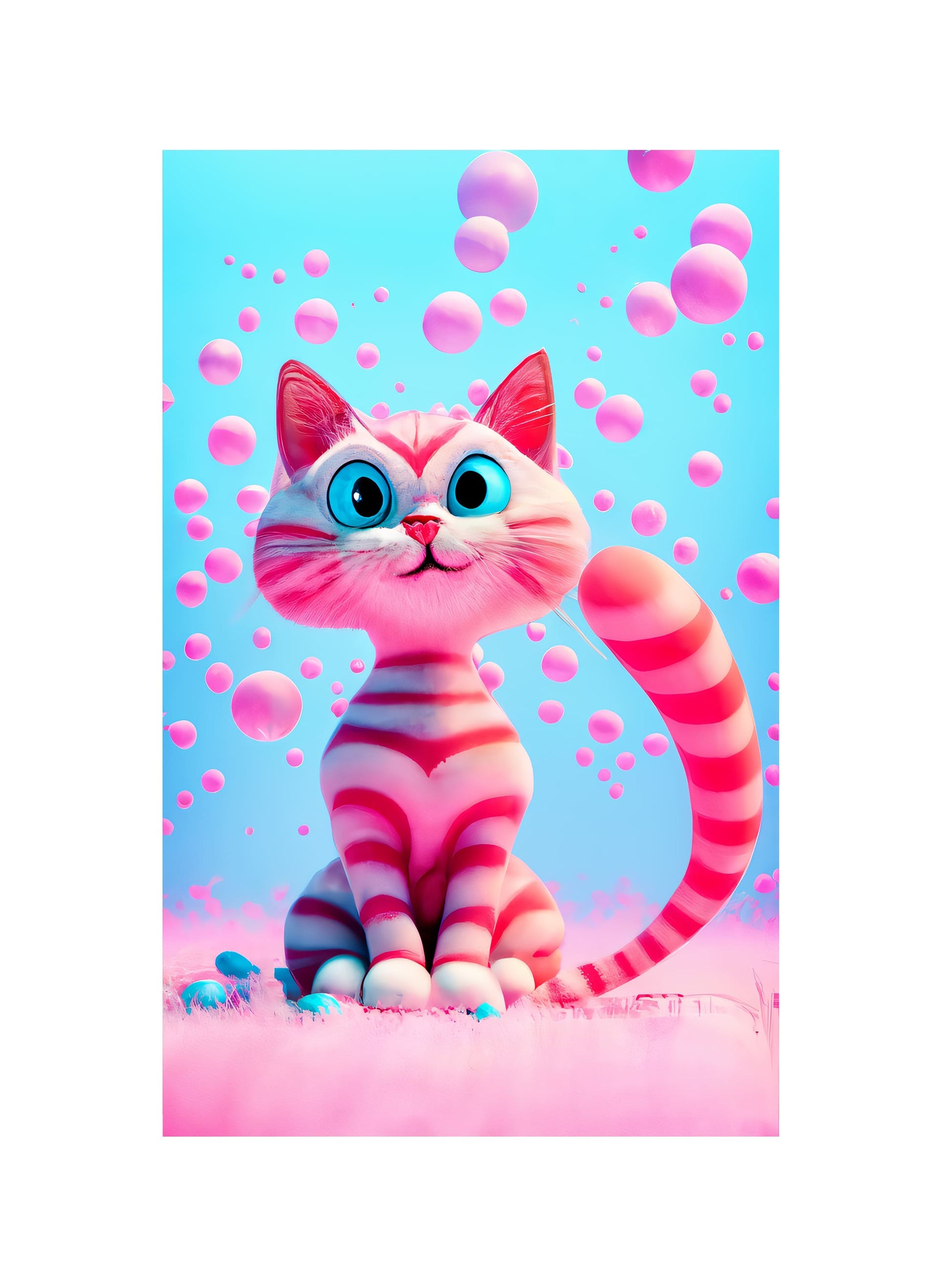Tailliertes T-Shirt mit einem großen, bunten Front-Aufdruck einer süßen Katze. Der Aufdruck ist sehr farbintensiv und strahlt auch in Natura. Die Ärmel sind in einem Pastel Pink und der Kragen in einem hellen Pastel Blau gehalten. Am Ärmel und am unteren Rücken ist je ein Aufdruck unseres Logos als Erkennungszeichen angebracht.
