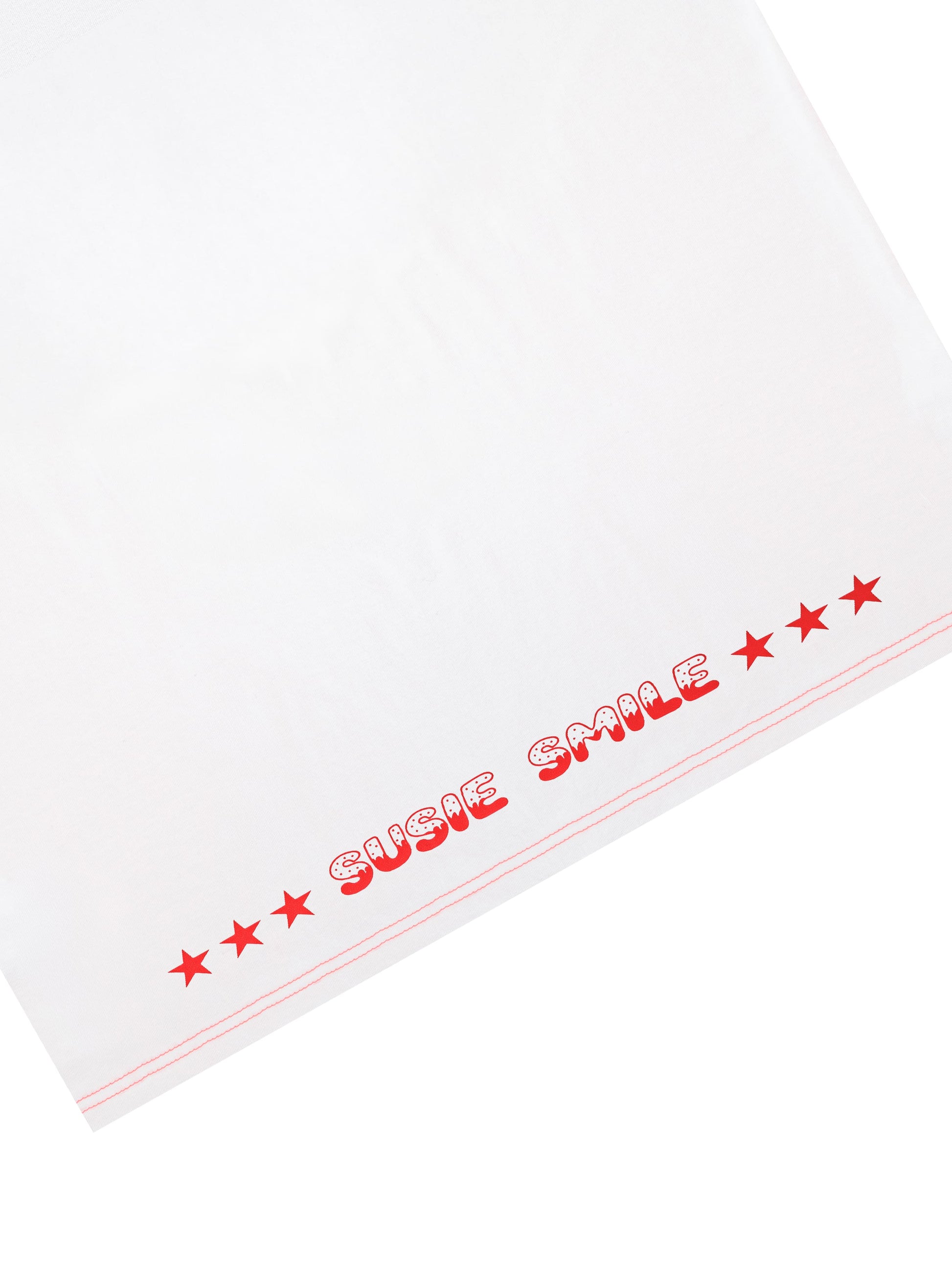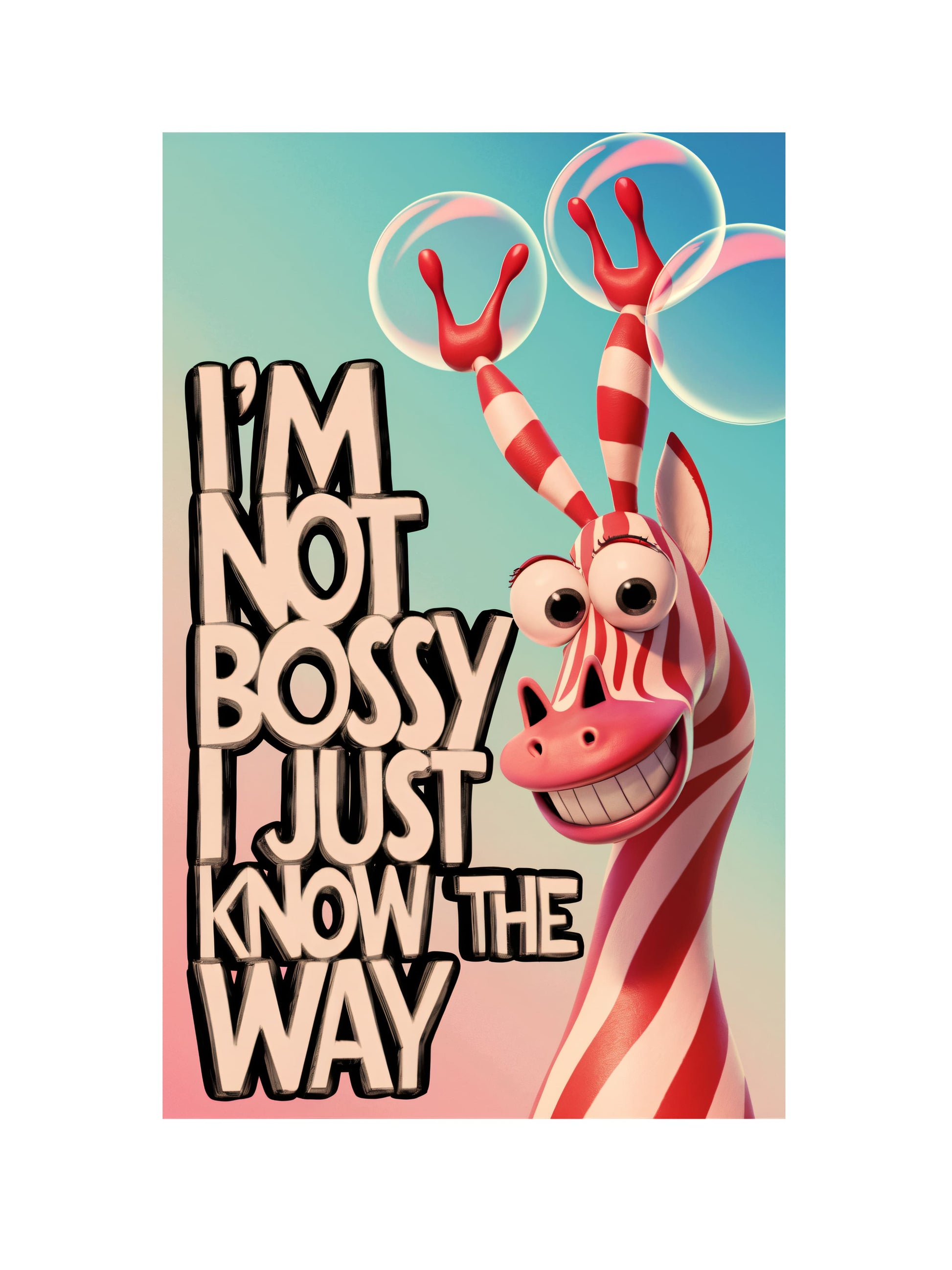 Tailliertes T-Shirt mit einem großen, bunten Front-Aufdruck mit einer Comic Giraffe und dem Slogan "I´m not bossy I just know the way". Der Aufdruck ist sehr farbintensiv und strahlt auch in Natura. Die Ärmel und der Kragen sind in einem warmen Rot-Ton gehalten. Am Ärmel und am unteren Rücken ist je ein Aufdruck unseres Logos als Erkennungszeichen angebracht.