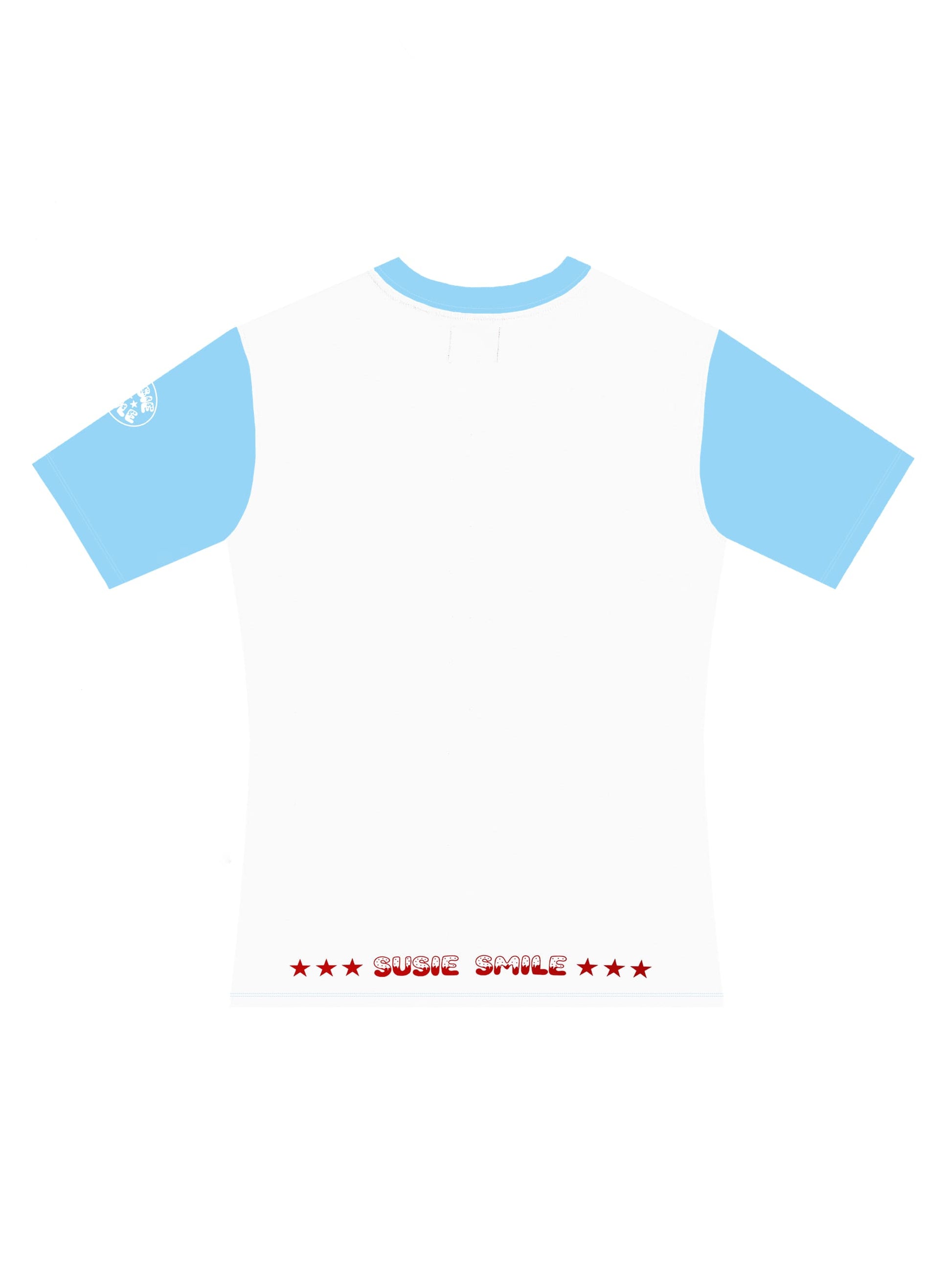 Tailliertes Weihnachts-T-Shirt mit einem großen, bunten Front-Aufdruck mit dem Slogan "Christmas in New York". Der Aufdruck ist sehr farbintensiv und strahlt auch in Natura. Die Ärmel und der Kragen sind in einem hellen Pastel Blau gehalten. Am Ärmel und am unteren Rücken ist je ein Aufdruck unseres Logos als Erkennungszeichen angebracht.